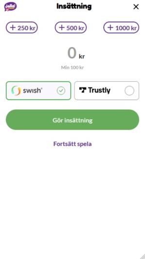 … die worden aangeboden, zijn Swish en Trustly. Ook kun je alleen geld storten en opnemen in Zweedse Kronen, er worden geen andere valuta geaccepteerd. Een van de voordelen als je Trustly gebruikt zijn de veilige en snelle financiële transacties – en dat is precies wat je kunt verwachten als je bij dit virtuele casino je winsten wilt laten uitbetalen.
