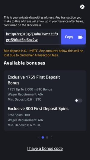 Als Bitcoin-casino wordt er geen overvloed aan promoties of bonussen aangeboden. Het casino richt zich meer op serieuze spelers die liever alleen hun eigen geld inzetten. Maar nieuwe spelers kunnen wel profiteren van een inschrijvingsbonus als ze hun eerste storting doen. De doorspeelvoorwaarden verschillen behoorlijk per spel, dus we raden je aan deze goed door te nemen voordat je met deze bonus gaat spelen.