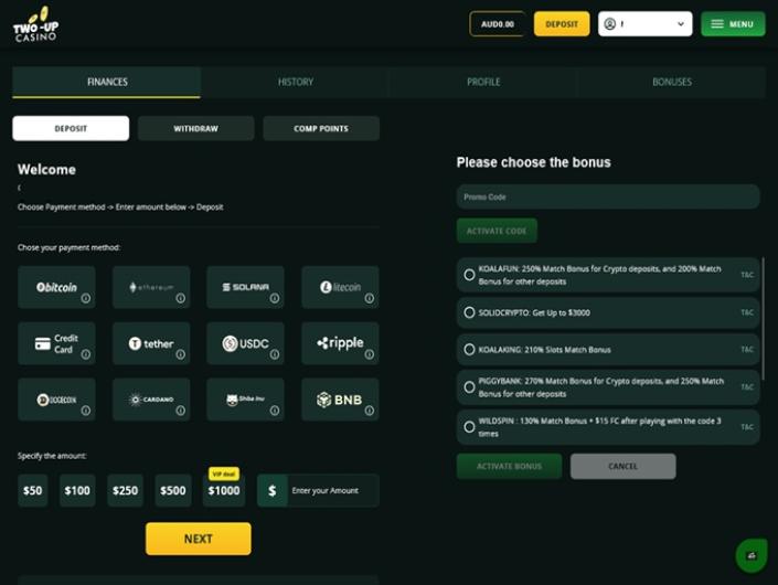 I really liked Two Up at one point. I was having fun playing games, especially Asgard and Super 6. Then I won.... And tried to withdraw... They took forever "verifying" and accepting the withdrawal. As soon as the money was withdrawn they said I could no longer use any bonus codes even though my win was off a deposit. Several days later I got an email saying I would only be paid $250 of my 2K withdrawal (which they say in T&Cs is withdrawable) and to withdraw again to get the rest which would incur another wait period. It all felt a little scammy at this point so I haven't deposited since. Oh and I obviously played through the other 1750.... Touche two up, touche.