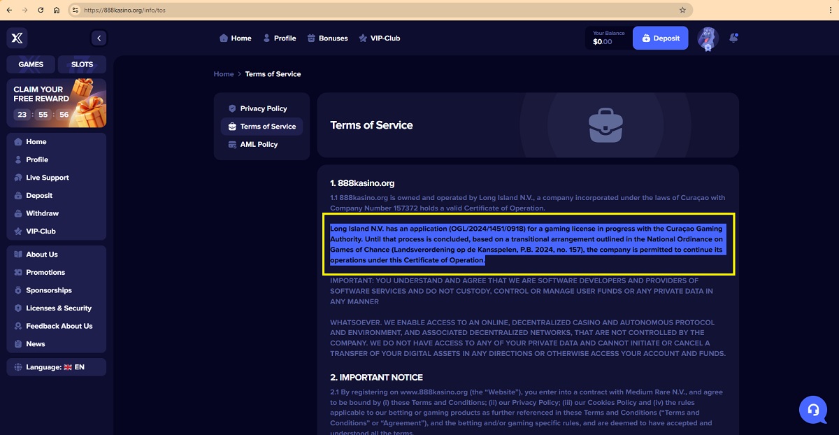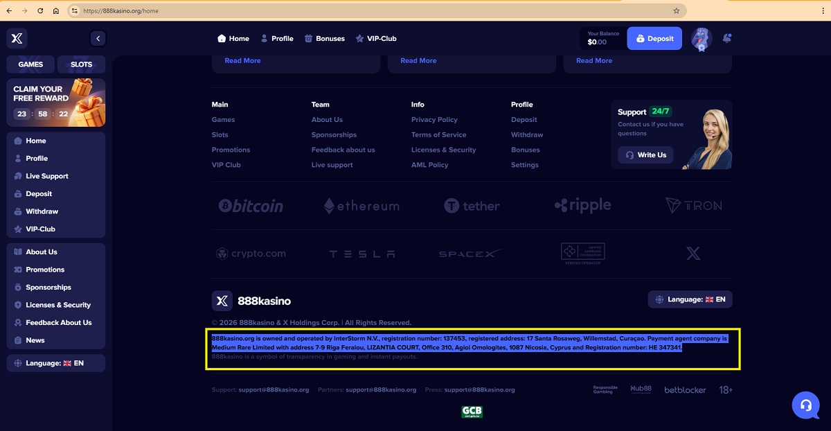 Based on official records and the information presented on the website, there are clear inconsistencies regarding company ownership. InterStorm (Curaçao) N.V., listed as the owner in the website footer and on the license and security page, was officially dissolved on 10 November 2025 and therefore cannot legally own or operate the casino. Meanwhile, the casino’s Terms and Conditions identify Long Island N.V. as the owner, despite its registration having been discontinued as of 2 October 2024.