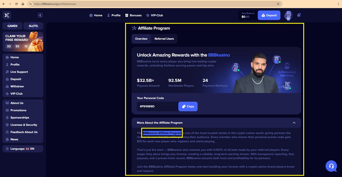 Based on the available public information, there is no verifiable evidence that a legitimate iGaming or crypto casino affiliate program operated under the name “888kasino Affiliate Program” currently exists. The claims describing a 888kasino Affiliate Program — including guaranteed payments of $10 per registered player, ongoing earnings of 0.001% of all bets, and references to transparent accounting and fast payouts — cannot be substantiated through reliable or industry-recognized sources.