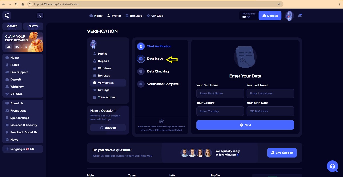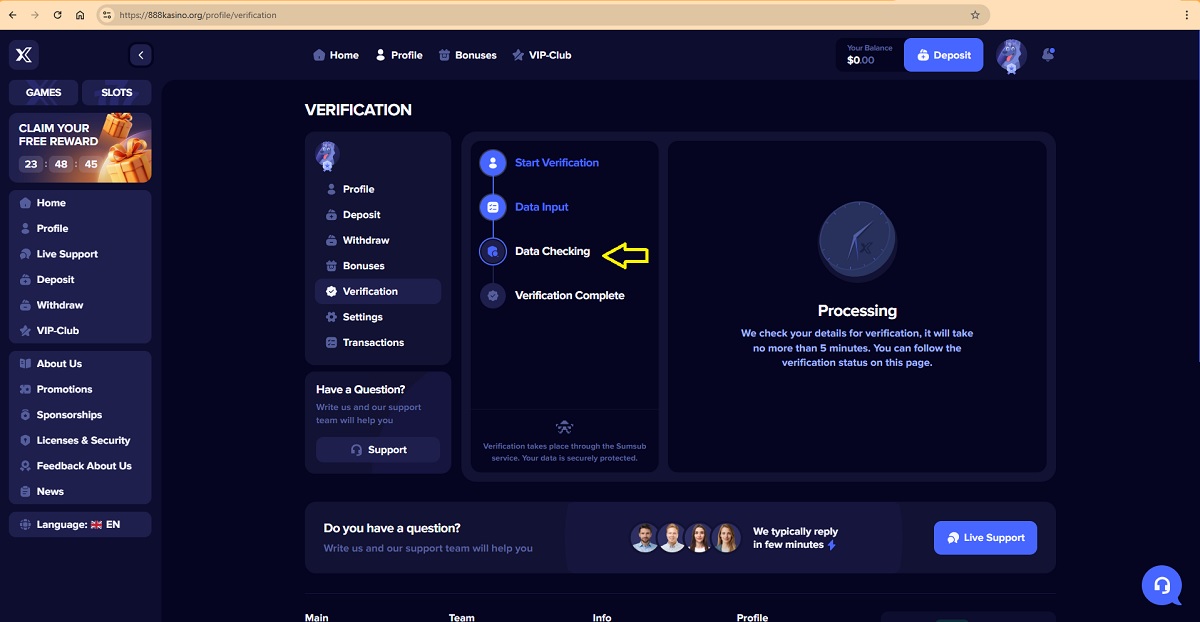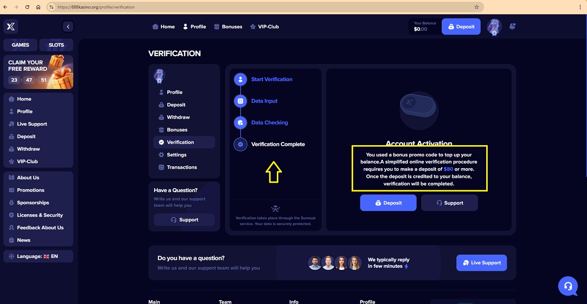 The alleged player account verification process on 888kasino.org represents a key scam pattern commonly used by fraudulent “casinos” to deceive players. When accessing their profile under the Verification tab, players are presented with a four-step process that is portrayed as a legitimate account verification procedure.