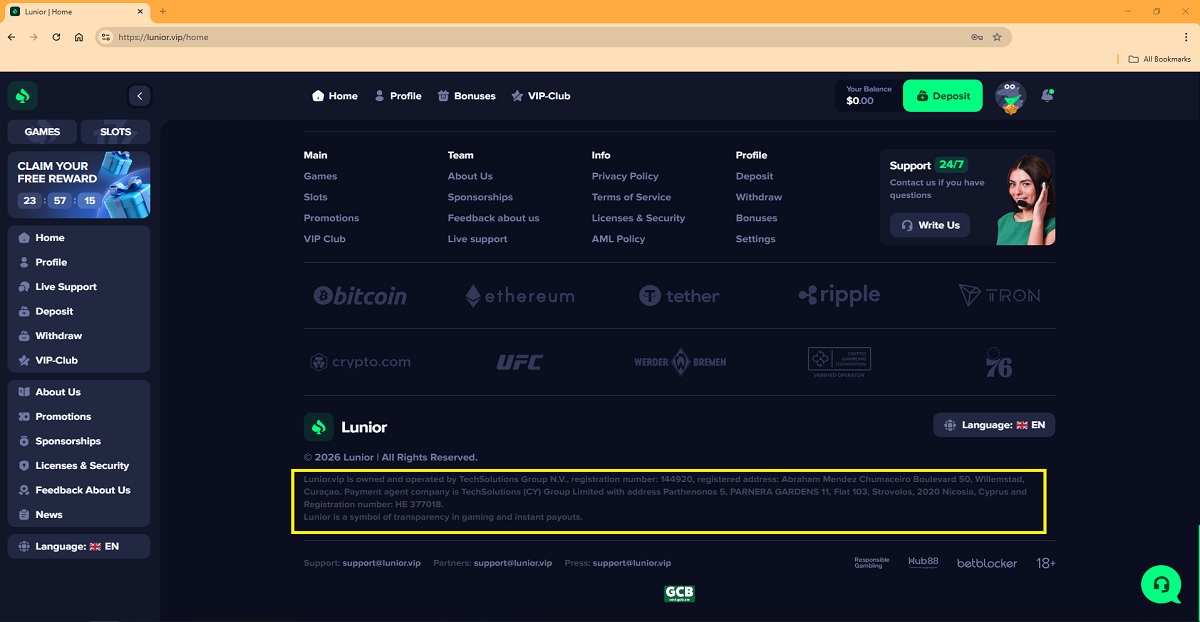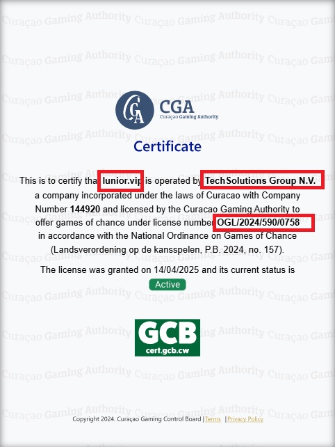 " lunior.vip is eigendom van en wordt beheerd door TechSolutions Group NV, registratienummer: 144920, geregistreerd adres: Abraham Mendez Chumaceiro Boulevard 50, Willemstad, Curaçao. De betalingsagent is TechSolutions (CY) Group Limited met adres Parthenonos 5, PARNERA GARDENS 11, Flat 103, Strovolos, 2020 Nicosia, Cyprus en registratienummer: HE 377018."