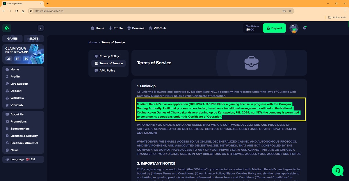 Volgens de officiële website van de Curaçao Gaming Authority (CGA) behoort licentienummer OGL/2024/1451/0918 toe aan een ander bedrijf, Medium Rare NV (bedrijfsregistratienummer 145353). De licentie werd afgegeven op 9 juni 2025 en verliep op 9 december 2025.
