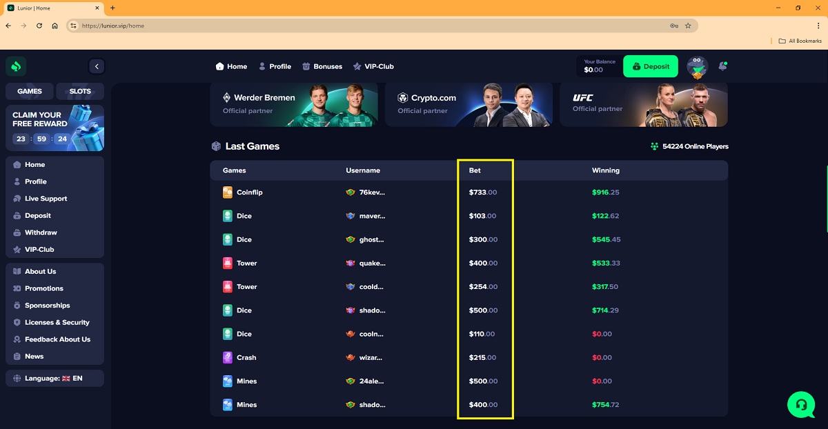lunior.vip Dit casino opereert zonder geldige goklicentie, maakt gebruik van nep-spelaanbieders en misleidt spelers met valse beweringen over regelgeving. Geld storten op dit platform brengt een hoog financieel risico met zich mee. Spelers wordt ten zeerste afgeraden dit casino te gebruiken.