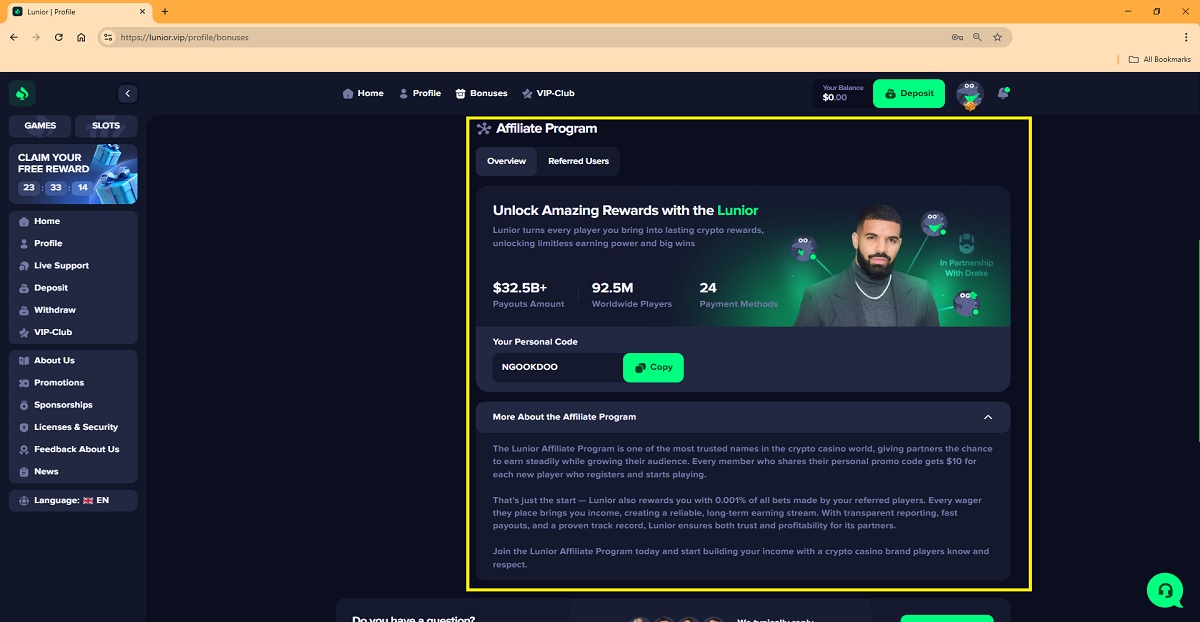 Op basis van de beschikbare openbare informatie is er geen aantoonbaar bewijs dat er momenteel een legitiem affiliateprogramma voor iGaming of cryptocasino's bestaat onder de naam "Lunior Affiliate Program". De beweringen over een Lunior Affiliate Program – waaronder gegarandeerde betalingen van $10 per geregistreerde speler, doorlopende verdiensten van 0,001% van alle inzetten en verwijzingen naar transparante boekhouding en snelle uitbetalingen – kunnen niet worden onderbouwd door betrouwbare of in de branche erkende bronnen.