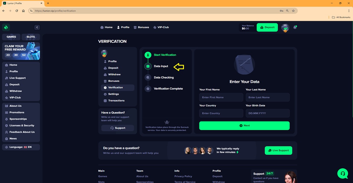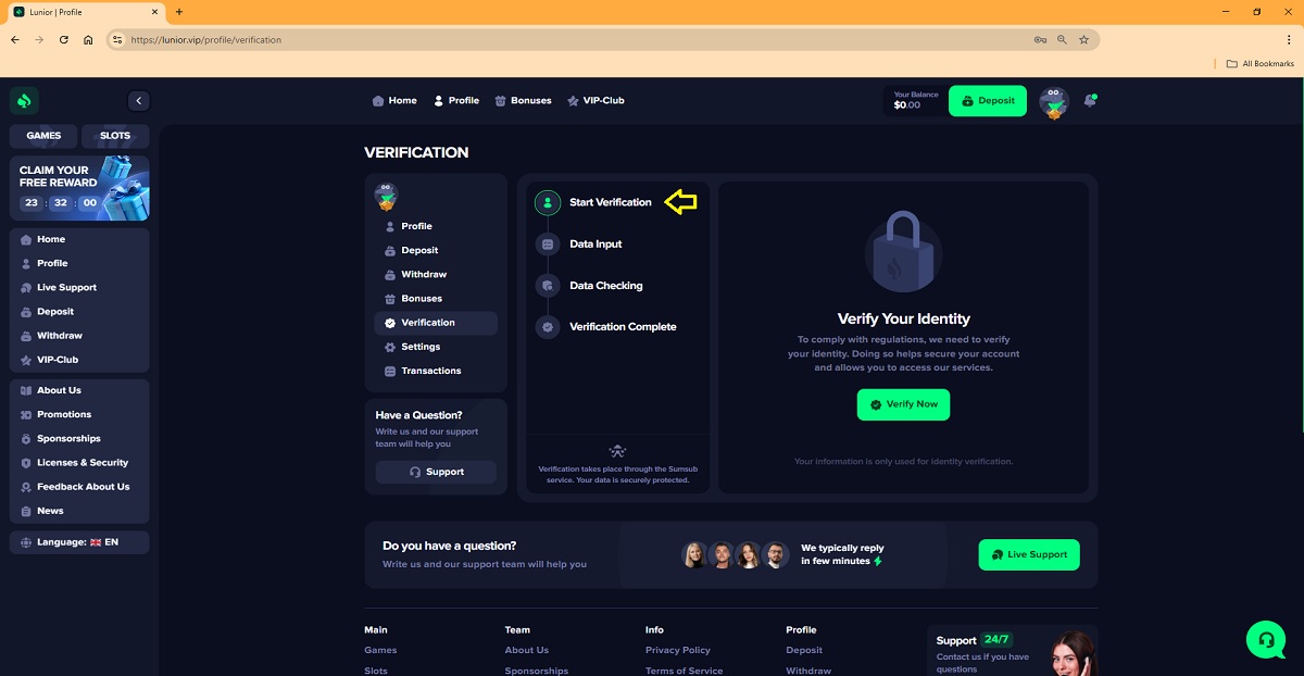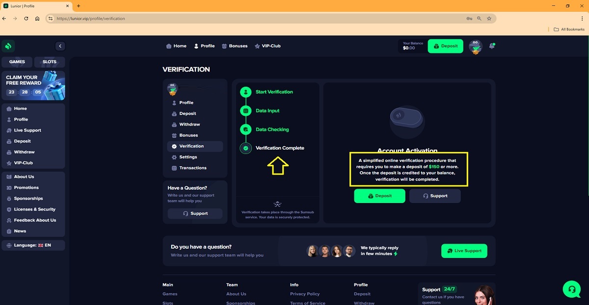 The alleged player account verification process on lunior.vip represents a key scam pattern commonly used by fraudulent “casinos” to deceive players. When accessing their profile under the Verification tab, players are presented with a four-step process that is portrayed as a legitimate account verification procedure.