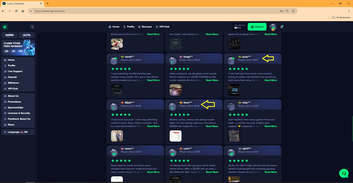 Op de website Op de feedbackpagina worden alleen positieve 5-sterrenbeoordelingen weergegeven. Sommige van deze beoordelingen beweren afkomstig te zijn van spelers die al sinds 2017 lid zijn, ondanks het feit dat het domein lunior.vip pas recent, op 6 maart 2026, is geregistreerd.