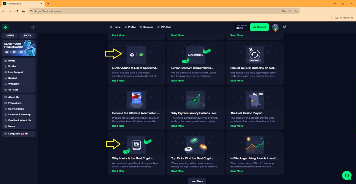 All articles published on the website’s news page contain false or misleading claims. They appear to be written with the intent to deceive players and create the impression that the website is a legitimate and regulated casino operator.