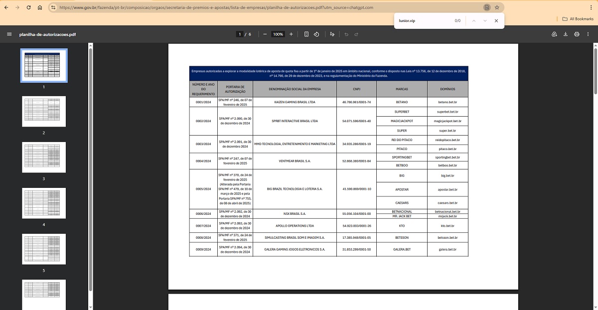 - Een controle van de officiële overheidslijst van erkende gokaanbieders in Brazilië laat zien dat het domein lunior.vip niet op deze lijst staat.