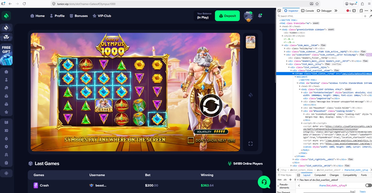Het casinoplatform toont een lijst met recente weddenschappen en winsten die worden toegeschreven aan vermeende spelers. De getoonde bedragen omvatten ongebruikelijk hoge inzetwaarden en frequente grote winsten, die niet stroken met realistisch spelersgedrag en gangbare gokpatronen.