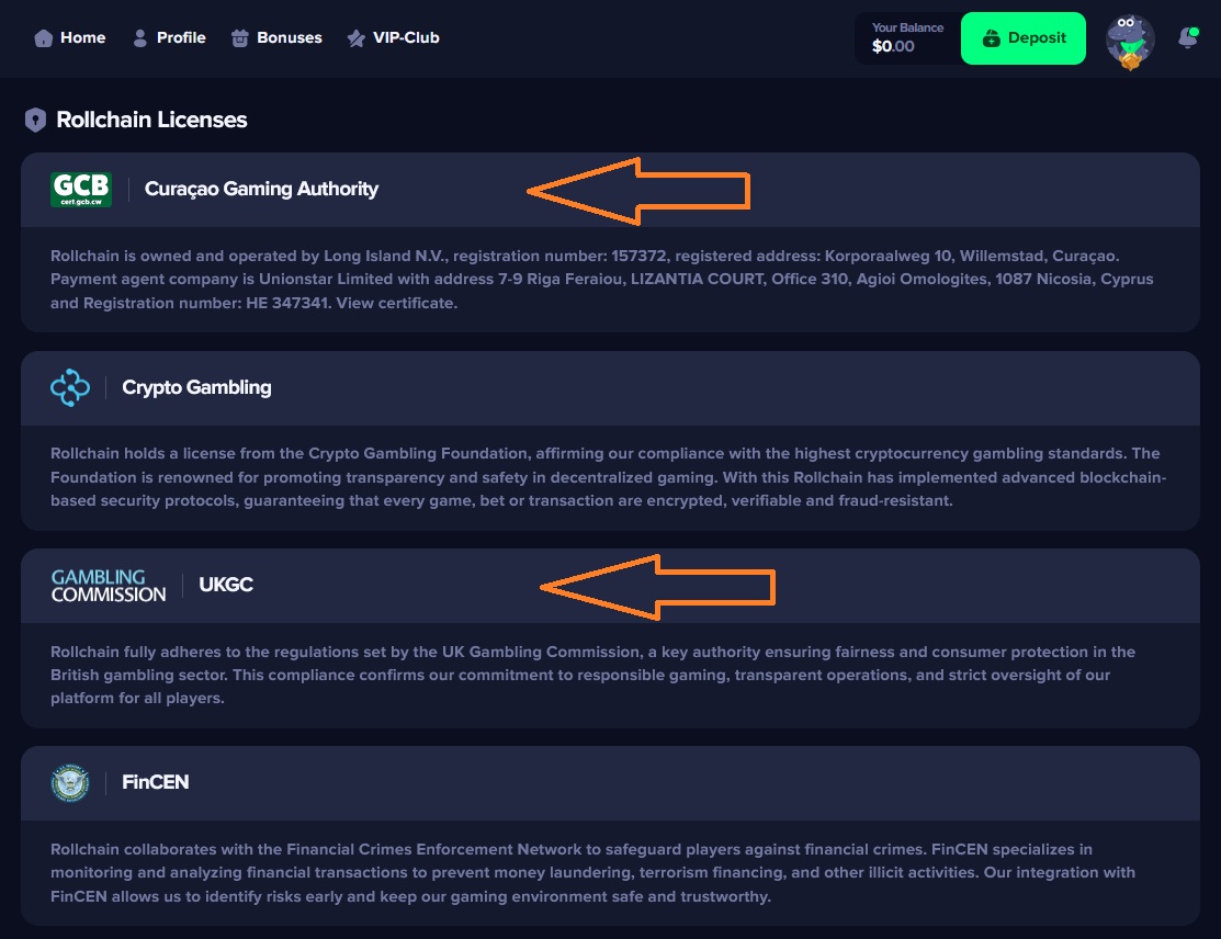 https://rollchain.today/ does not hold any license. The information provided on their website is misleading, as they are not authorized or regulated by the UK Gambling Commission, and if you visit the official Curaçao Gaming Authority website, you’ll see that they are not listed there.
