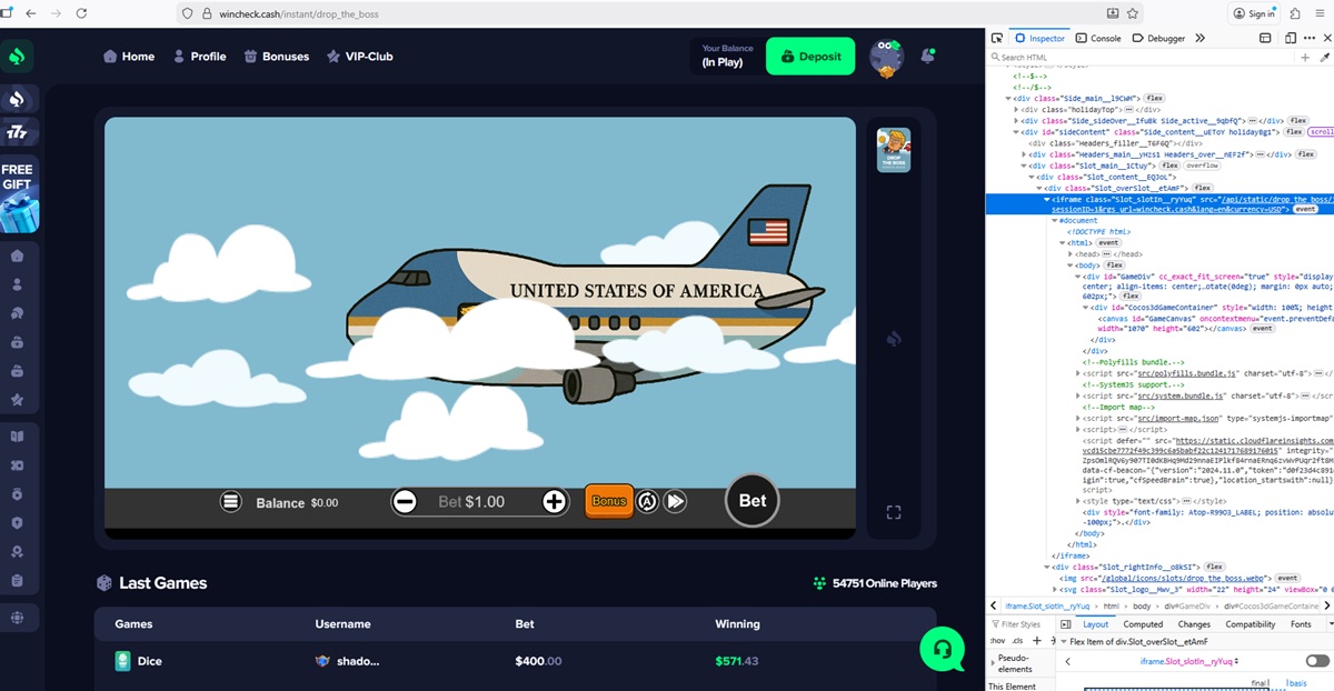 Het casinoplatform toont een lijst met recente weddenschappen en winsten die worden toegeschreven aan vermeende spelers. De getoonde bedragen omvatten ongebruikelijk hoge inzetwaarden en frequente grote winsten, die niet stroken met realistisch spelersgedrag en gangbare gokpatronen.