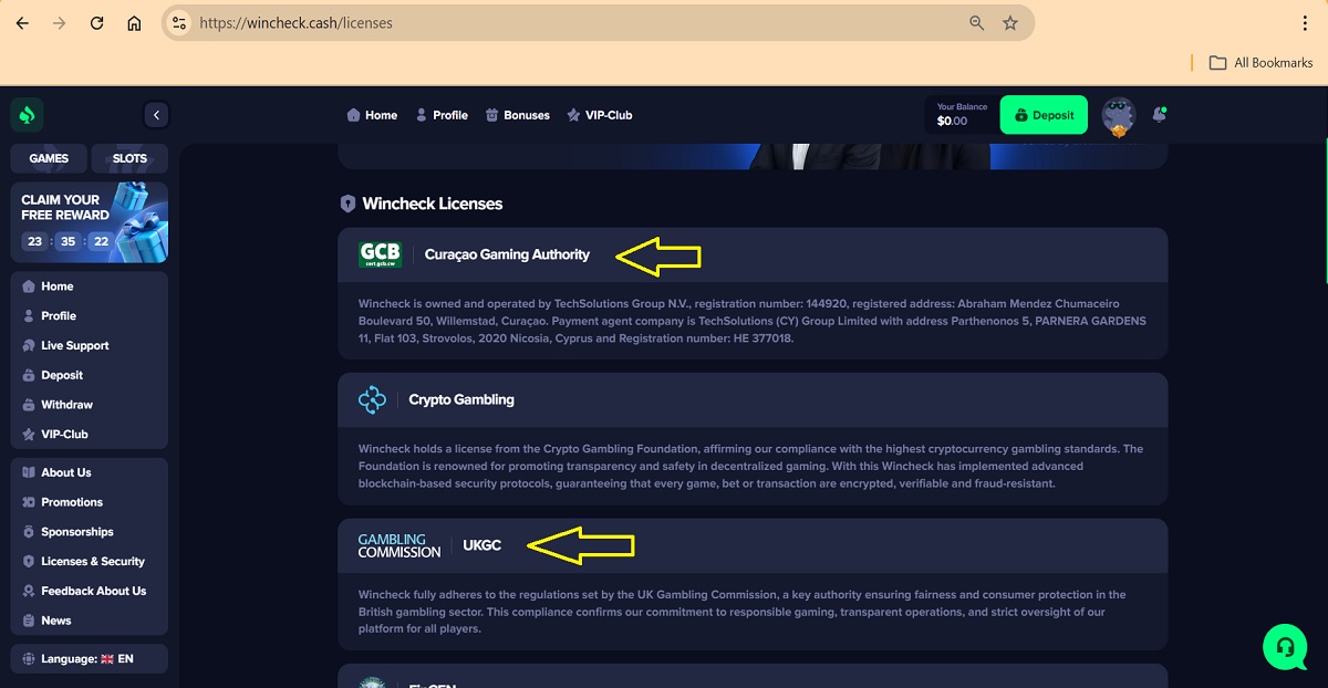 Ondanks hun beweringen beschikt wincheck.cash Casino niet over een vergunning van de Britse Kansspelcommissie. De informatie op hun website is misleidend, aangezien ze niet geautoriseerd of gereguleerd zijn door de Britse Kansspelcommissie.