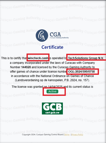 Het document dat is gepubliceerd op de De website wincheck.cash vermeldt TechSolutions Group NV (bedrijfsregistratienummer 144920) als licentiehouder en verwijst naar licentienummer OGL/2024/590/0758, met de vermelding dat de licentie is afgegeven op 14-04-2025 en dat de huidige status ACTIEF is.