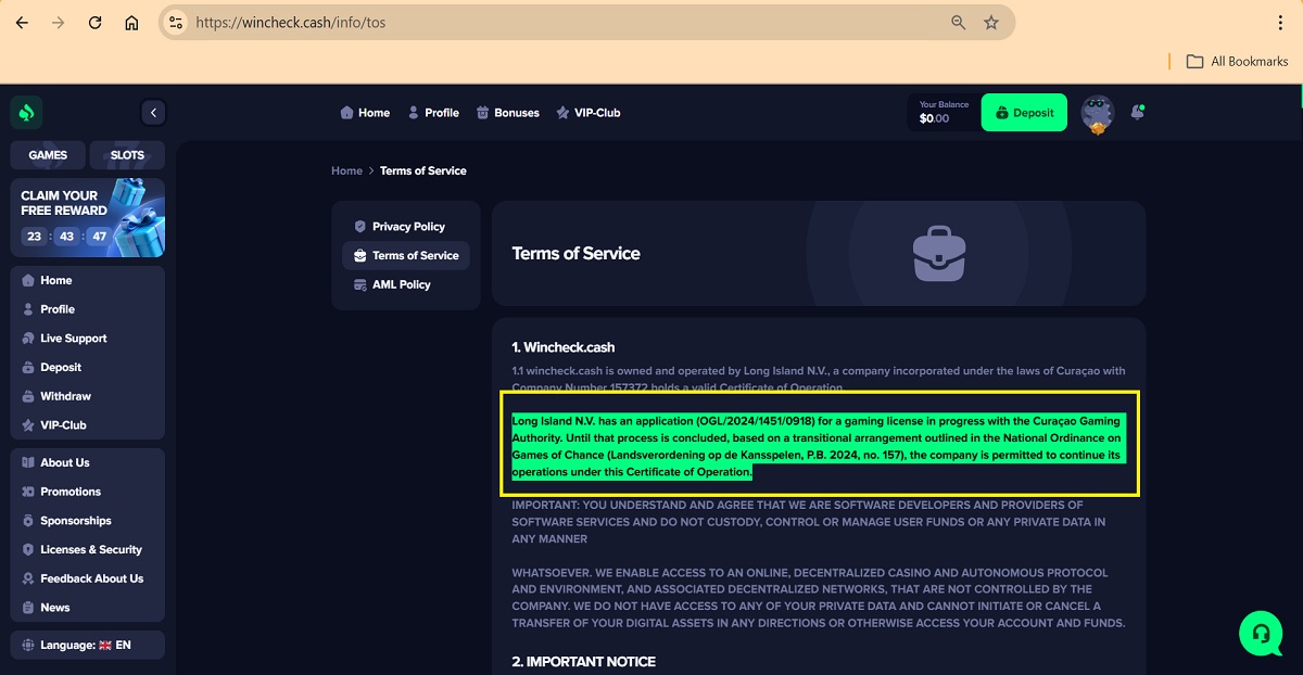 " Wincheck.cash is eigendom van en wordt beheerd door TechSolutions Group NV, registratienummer: 144920, geregistreerd adres: Abraham Mendez Chumaceiro Boulevard 50, Willemstad, Curaçao. De betalingsagent is TechSolutions (CY) Group Limited met adres Parthenonos 5, PARNERA GARDENS 11, Flat 103, Strovolos, 2020 Nicosia, Cyprus en registratienummer: HE 377018."