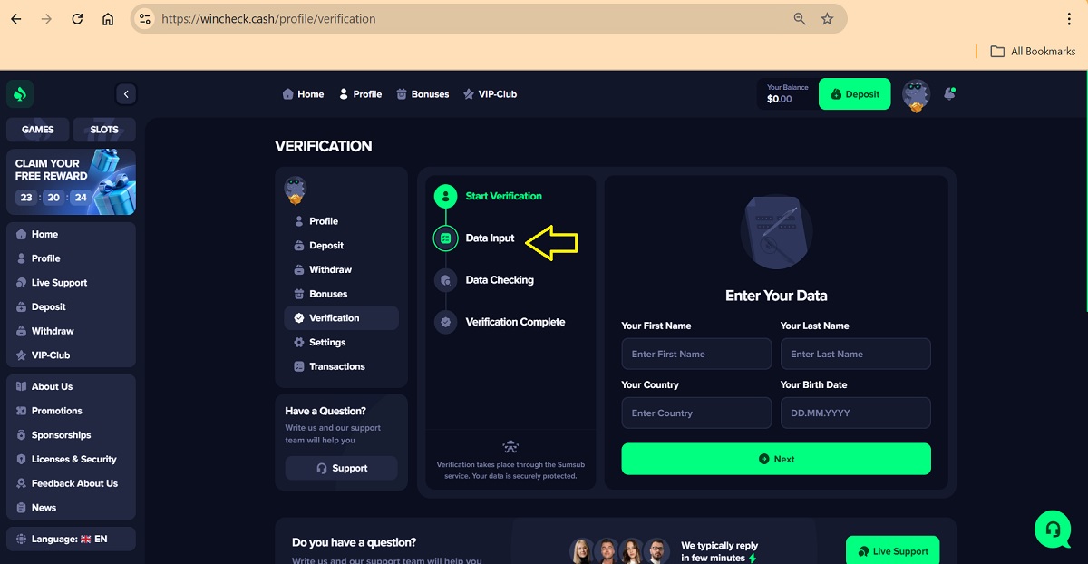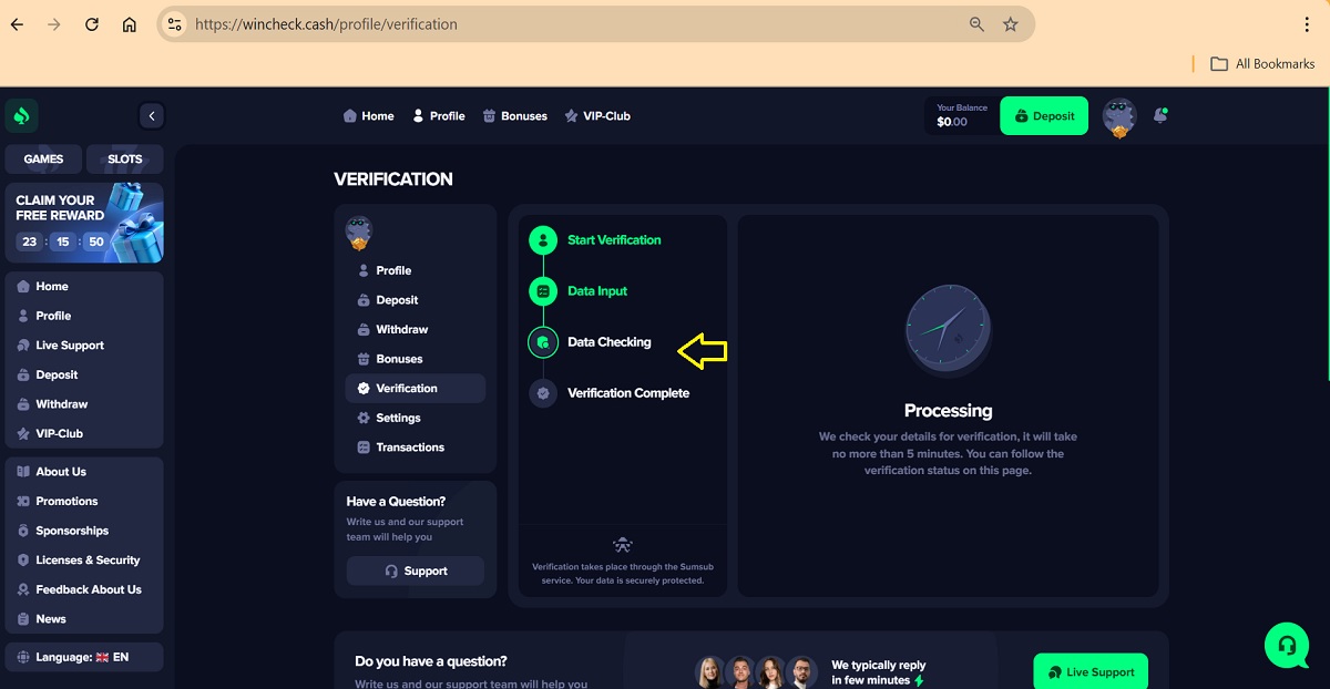 The alleged player account verification process on wincheck.cash represents a key scam pattern commonly used by fraudulent “casinos” to deceive players. When accessing their profile under the Verification tab, players are presented with a four-step process that is portrayed as a legitimate account verification procedure.