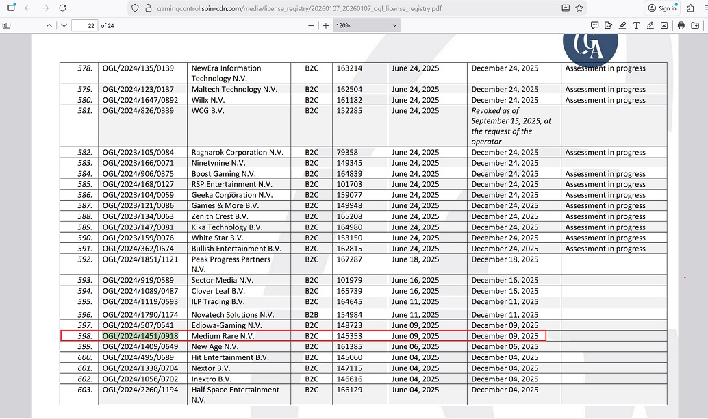 Volgens de officiële website van de Curaçao Gaming Authority (CGA) behoort licentienummer OGL/2024/1451/0918 toe aan een ander bedrijf, Medium Rare NV (bedrijfsregistratienummer 145353). De licentie werd afgegeven op 9 juni 2025 en verliep op 9 december 2025.