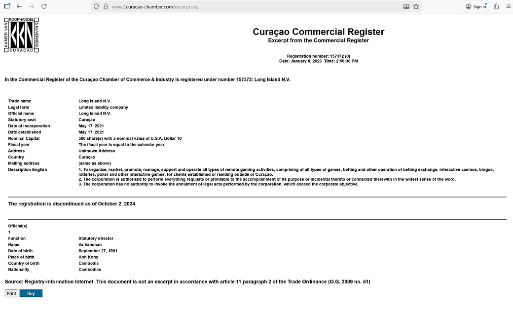 According to information available on the official website of the Curaçao Chamber of Commerce & Industry (the business and industry chamber representing the economic interests of the island of Curaçao), Long Island N.V. company’s registration was discontinued as of October 2, 2024.