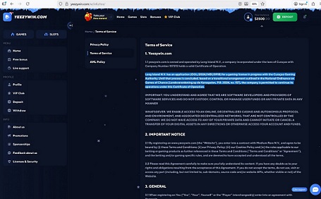 Yeezywin Casino operates without a valid gambling license, features fake game providers, and misleads players with false regulatory claims. Depositing money on this platform carries a high financial risk. Players are strongly advised to avoid this casino.