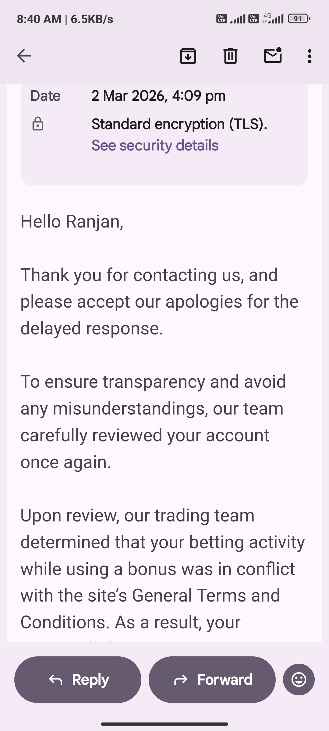In their email dated 2 March 2026, they stated that my betting activity violated their Terms and Conditions.