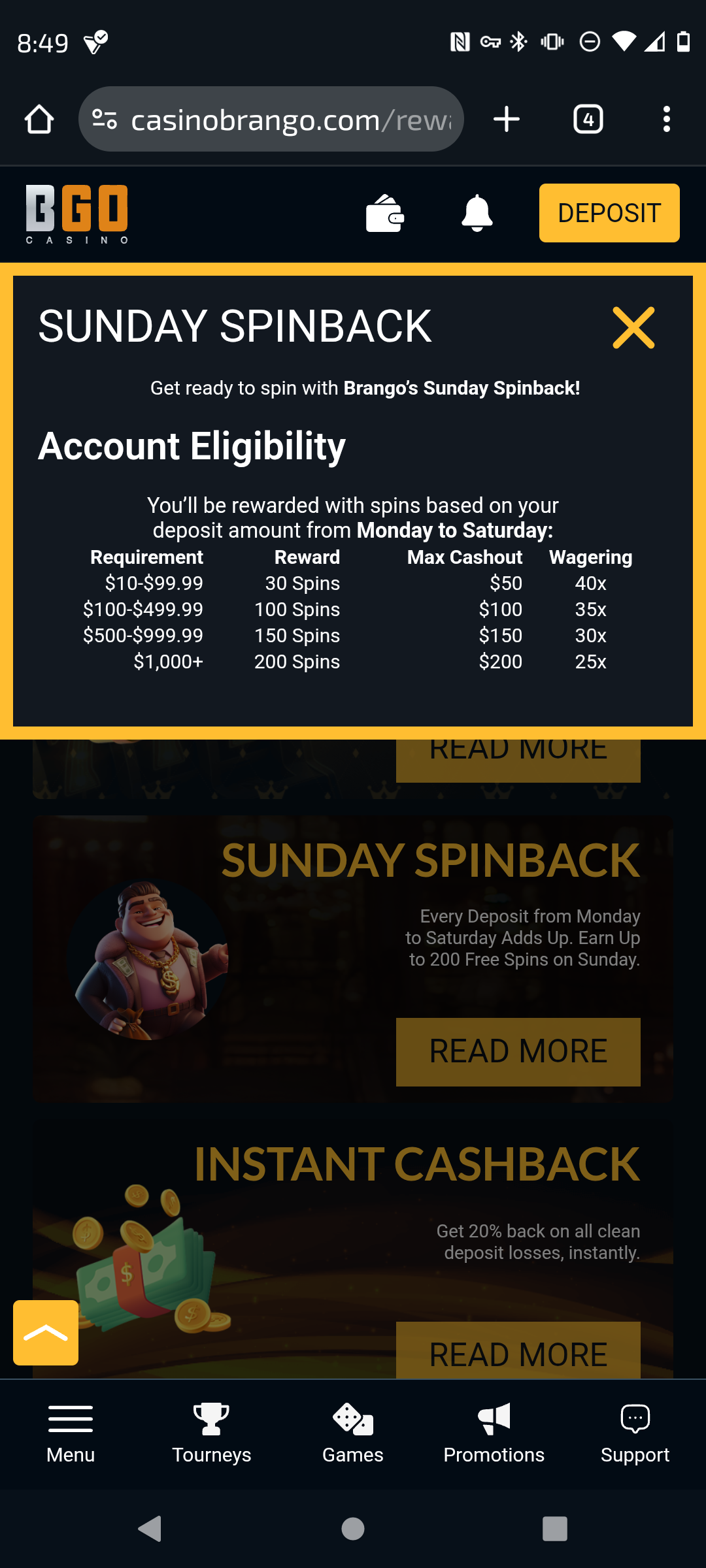 hello im having an issue with the Sunday spins. I deposited over 100$ the last 8 days but then I used a bonus code and was able to withdraw 50$. but the promotion says based on you deposit, now I'm being given the unfortunately script when I was able to do Sunday spins on other casinos that I made a withdrawal on. username l*****