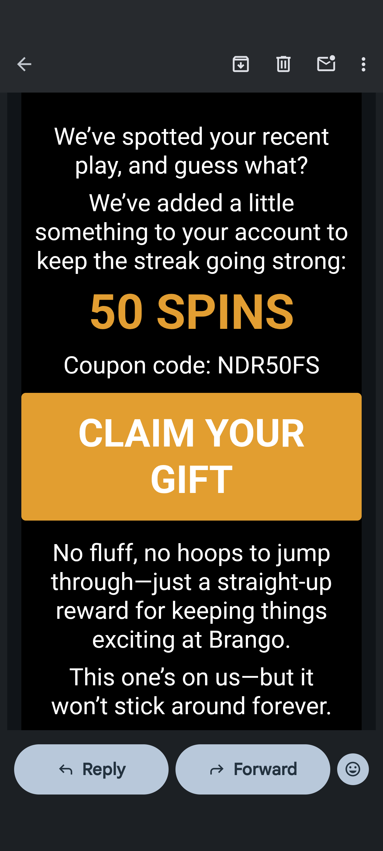 Yes I received an email saying I was rewarded with 100 free spins Promo code NDR100FS but it won't work and support is being unhelpful like usual. Email is *****